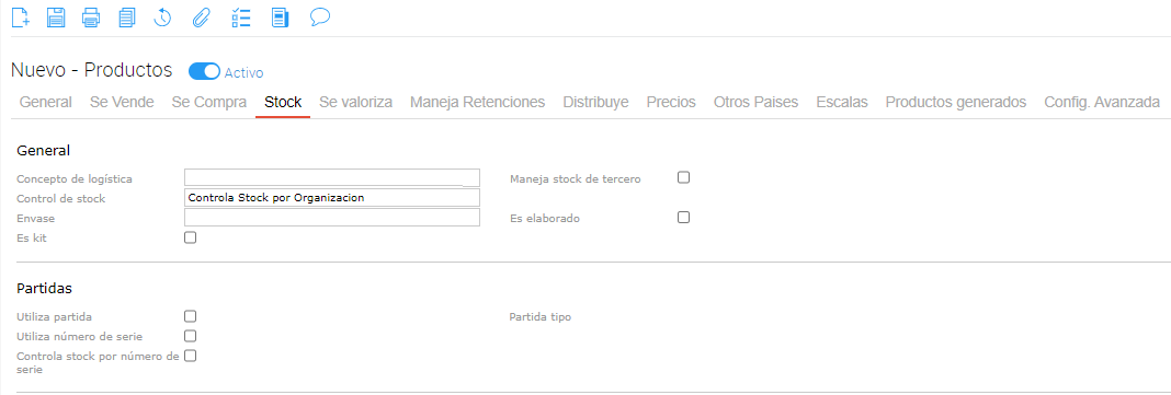 Utiliza partida: al seleccionar esta opción, se indica que se desea llevar trazabilidad por partida, lote o rodeo (en el caso del producto de Agro) para el producto que se está creando. Con lo cual se obliga al usuario a identificar la partida o lote a la que pertenece el producto que intervenga en una transacción. La forma de creación o uso de las mismas, depende de la configuración de cada uno de los tipos de documentos en donde intervenga. Para más datos, referenciar a “Tipos de Documentos”.
