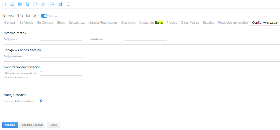 Posee Atributos Variables: Este check se utiliza para indicar que el producto va a ser generador de múltiples productos y habilita las solapas Escalas y Productos Generados. Sólo puede seleccionarse al momento de alta del producto. Al guardar NO puede modificarse este atributo.