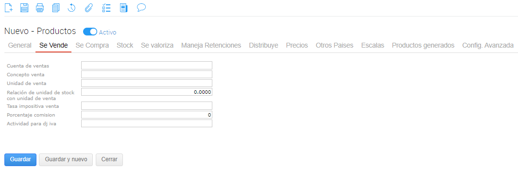 Se vende: al tildar este check habilita la solapa Se vende para realizar las configuraciones necesarias para ventas. Cuando se da de alta un producto nuevo, este check está sin tildar.