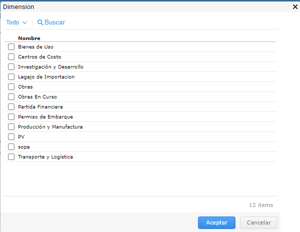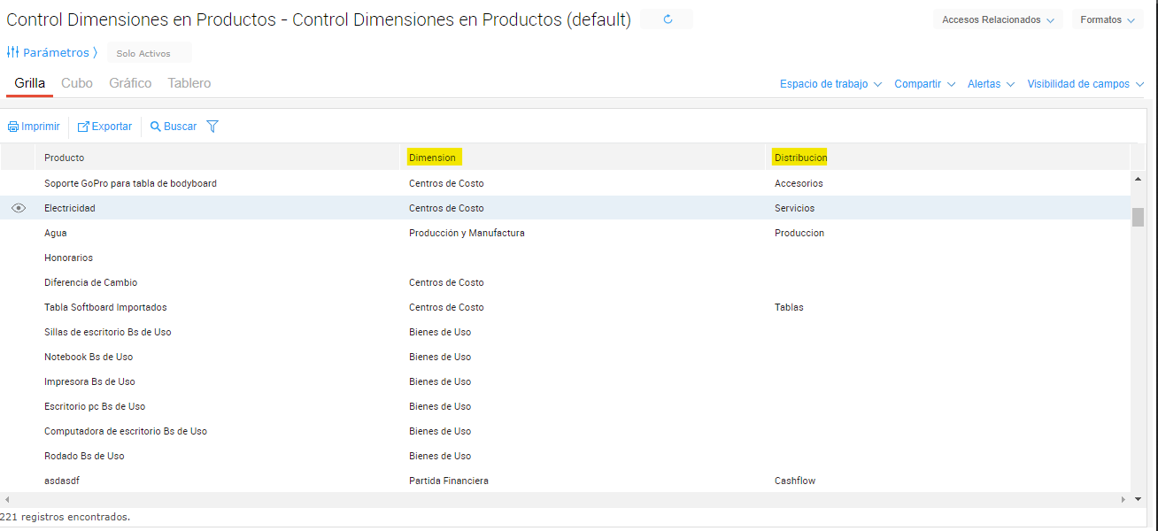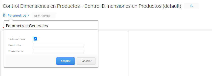 Dimensión: se selecciona la dimensión por las cuales filtraremos el informe . Si se deja vacío el parámetro, se pueden visualizar todos los productos y sus respectivas dimensiones y en el caso que haya un producto sin dimensiones también se visualiza el mismo