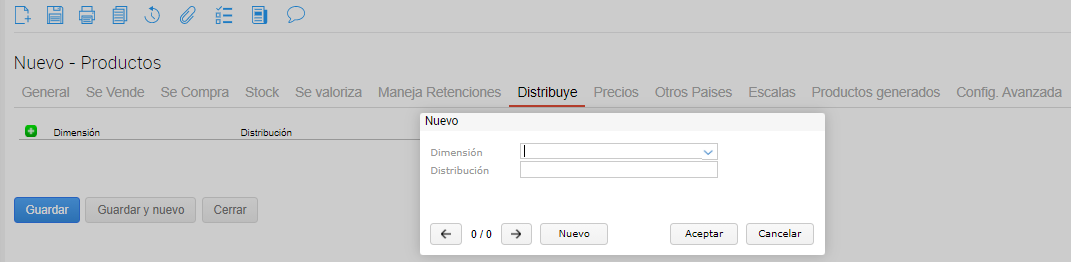 Distribución: permite seleccionar una distribución por defecto de las asociadas a la dimensión elegida, que es la que se utiliza en el producto definido, en el caso de que la configuración del tipo de documento en donde intervenga indique como modo de distribución la opción del Producto.