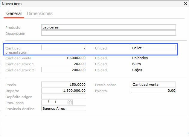 Esta funcionalidad permite cargar cantidades utilizando distintas presentaciones. Dichas presentaciones tendrán una relación lineal entre ellas.