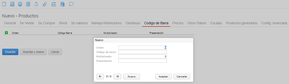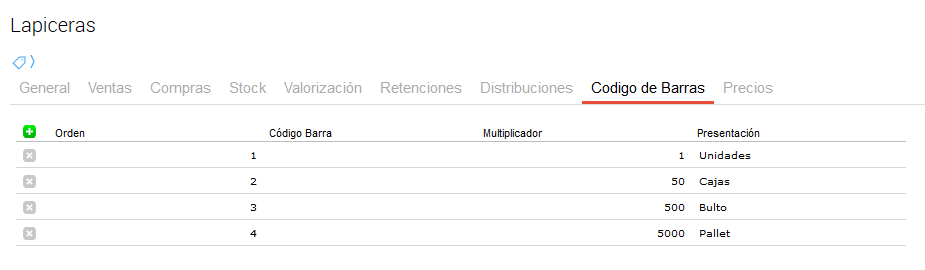 - Estos nuevos campos sólo se observarán en caso de que el producto tenga configuradas presentaciones en la solapa Código de Barras.