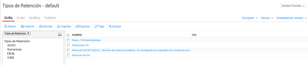 Tipo: indica si es retención, percepción u otra. Es importante esta categorización, ya que es utilizada luego en la selección de los tipos de retención para la importación de padrones.