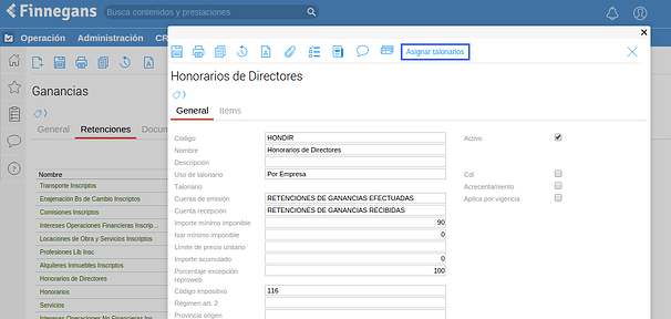 Cada concepto de retención debe estar asociado a un talonario. En la mayoría de los casos los distintos conceptos de retención de un determinado impuesto tienen configurado el mismo talonario. Por ejemplo, los honorarios, enajenación de bienes de cambio tienen el mismo talonario de Retención Ganancias.