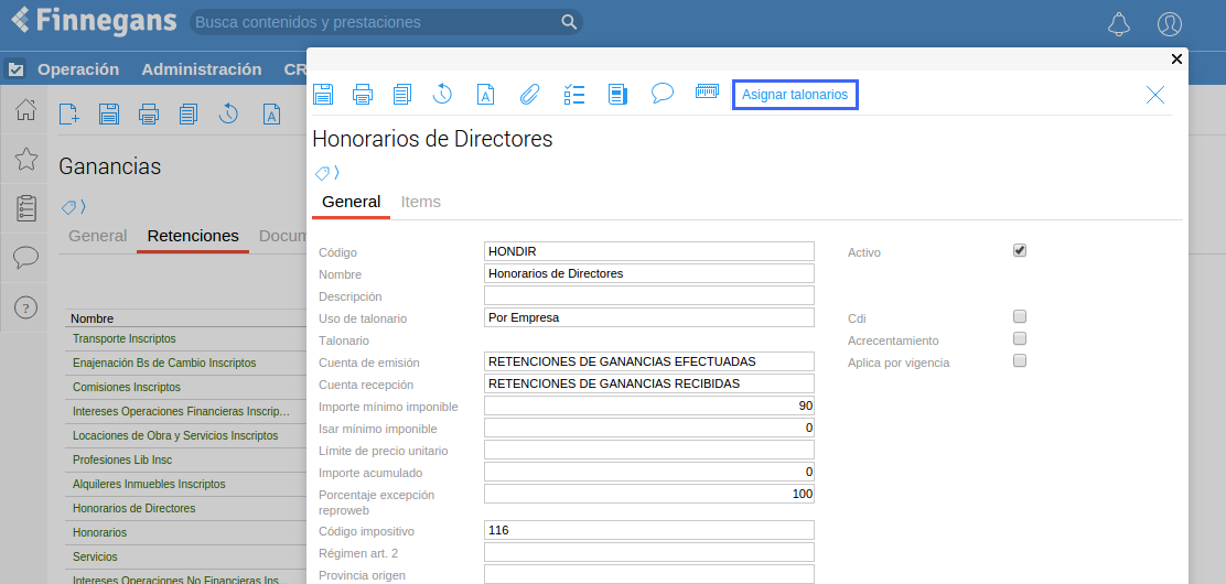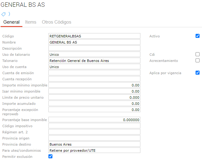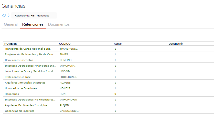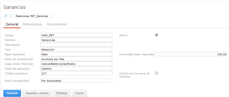 Activo: indica si el tipo de retención creado se encuentra o no disponible para su selección y utilización en nuevas transacciones o en los maestros de configuración que lo requieran.