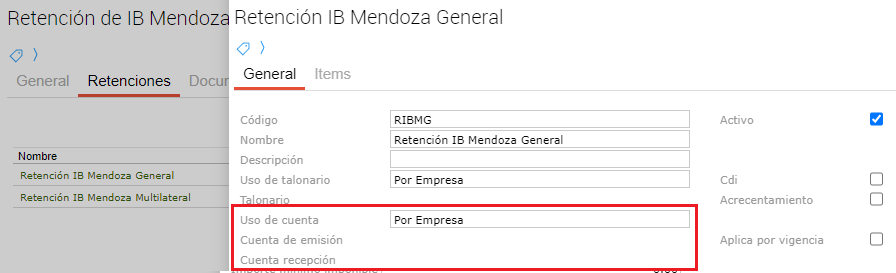 En caso de que dentro de un mismo tipo de retención se quieran incluir distintas retenciones que utilicen diferenciadamente cuentas o talonarios únicos y por empresa, debe realizarse su configuración de la siguiente forma: