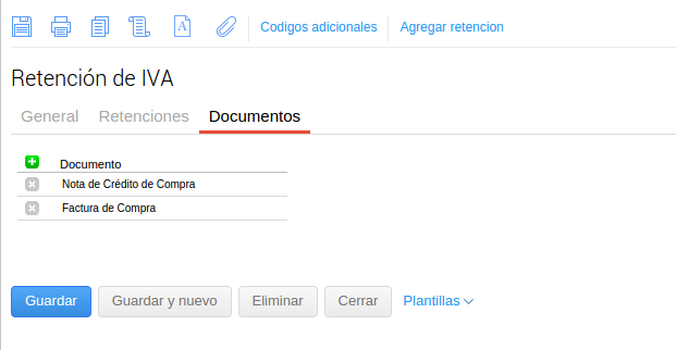 Cuando la retención está configurada como ORIGEN, es decir que se va a retener sobre una factura que se está abonando, en la solapa “documentos” se ingresan todos aquellos documentos que “restarían” de esa factura en caso de estar aplicados.