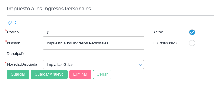 Para poder configurar diferentes tipos de impuesto, asociar la novedad a informar en caso de ser necesario y determinar si es retroactivo al inicio del año en todos sus cálculos.