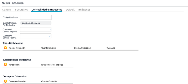 Aquí se editaran los datos contables e impositivos referidos a la empresa. Mostrará distintos campos según el país donde opere la organización.