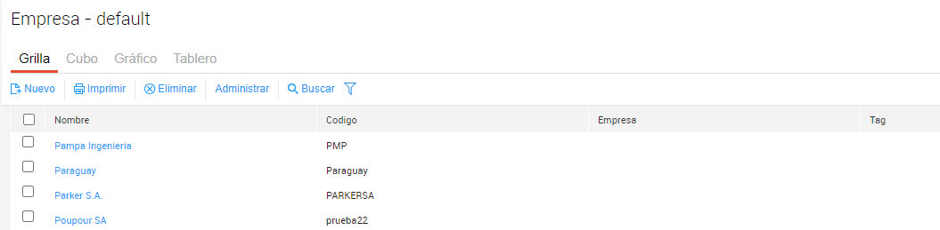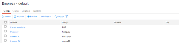 Al ingresar, el sistema presenta la lista de las mismas. Desde aquí es posible agregar nuevas empresas (a través de la utilización de una como modelo o sin una referencia), editar o eliminar las existentes.
