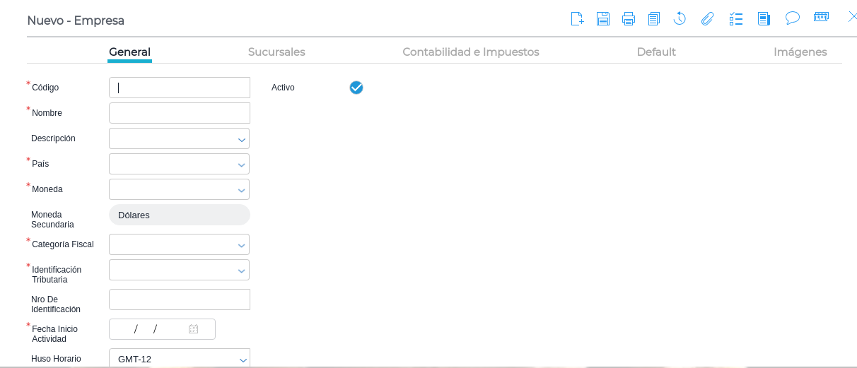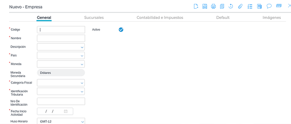 Moneda: en este campo, se indica la moneda principal en la que se realizarán las transacciones y se verán los informes de la empresa en cuestión. Este campo es obligatorio.