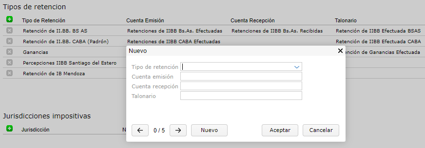 En este apartado se configuran los tipos de retención que se aplican por defecto a la Empresa creada al momento de registrar las operaciones. Además, a través de la misma podrás configurar las cuentas que impactarán en la retención/percepción y el talonario que usará.