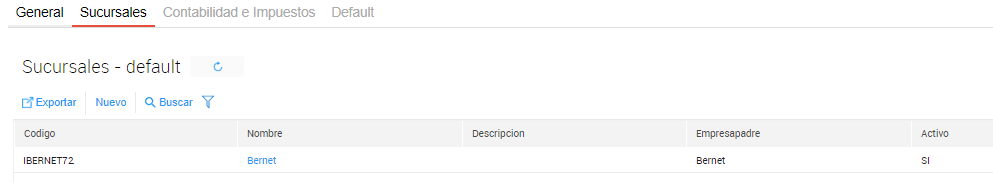 Cada empresa en el sistema debe tener al menos una sucursal. Es por esto que cada vez que se ingrese una empresa nueva, el sistema generará un registro igual como sucursal. La sucursal trasladará los datos de Código y Nombre y tendrá la relación con la empresa padre.