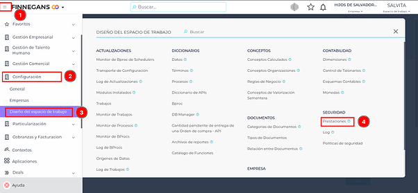 Para realizar esto, accedemos a “Prestaciones” a través del menú → configuración → diseño del espacio de trabajo → seguridad → prestaciones
