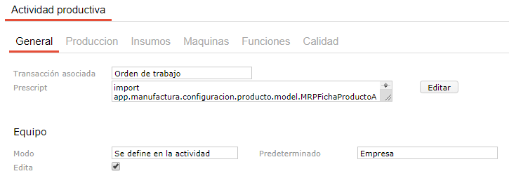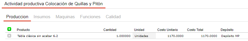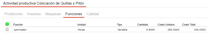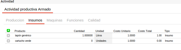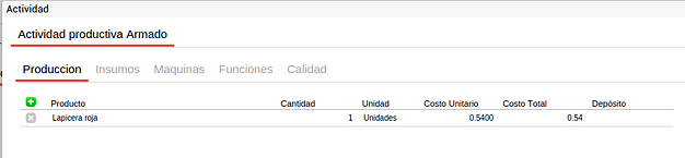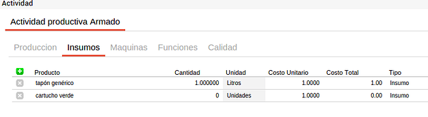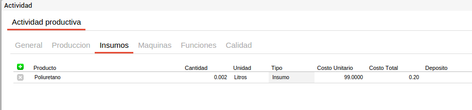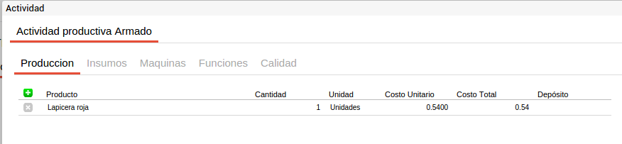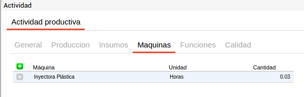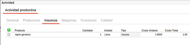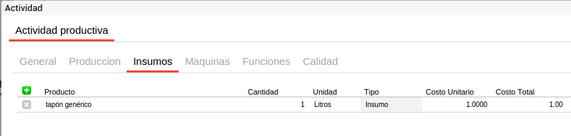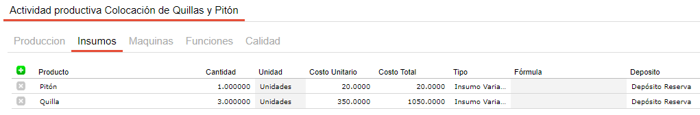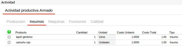 En cada actividad se pueden incluir los recursos comunes a todos los productos que se elaborarán a partir de este proceso con el fin de facilitar la carga de la información. Es decir que si por ejemplo se tiene una actividad de corte que utiliza media hora máquina de sierra de bancada y este recurso es común para todos los insumos que pasen por esta actividad y el tiempo empleado es siempre el mismo, este recurso se puede definir en el proceso productivo y para cada fórmula de producción que utilice este proceso productivo y la actividad “corte” heredará esta información.