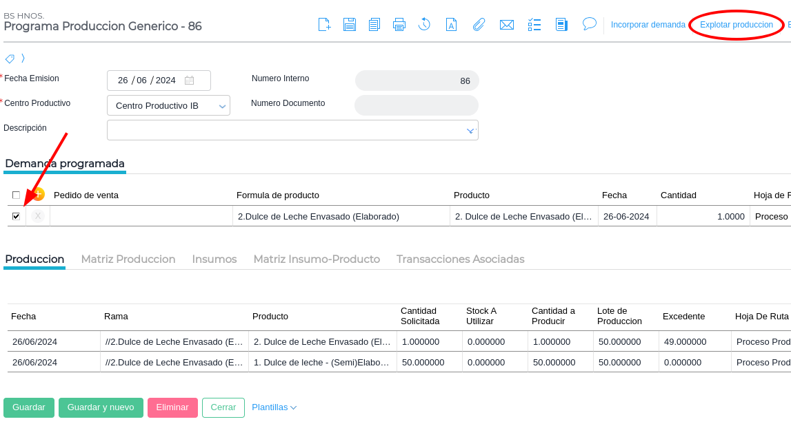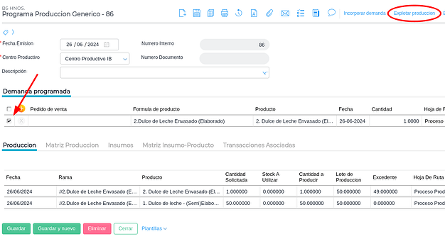 Una vez indicadas las cantidades a producir se deben marcar los ítems a producir y presionar el botón “Explotar producción”.