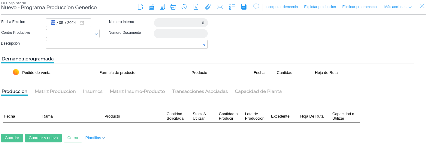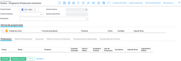 - Cantidad a producir: Cantidad que se necesita producir para completar el pedido (cantidad demandada - stock en depósito de producto terminado).