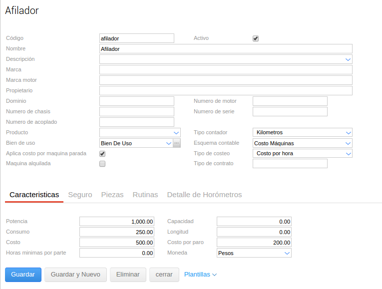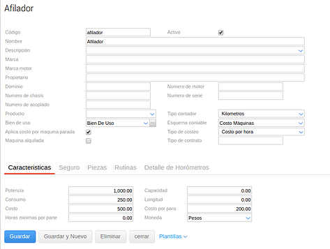 Se debe indicar el código, nombre, tildar el check de activo, el costo por paro de máquina, el tipo de costeo, tipo de contador y se puede debe indicar un producto y un bien de uso.
