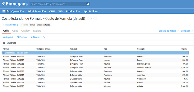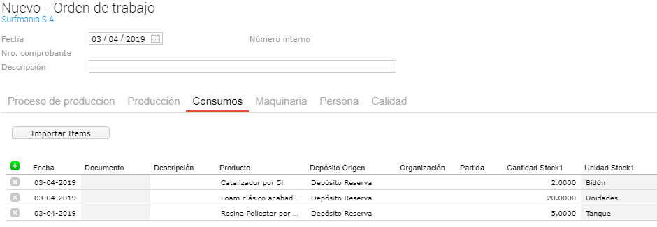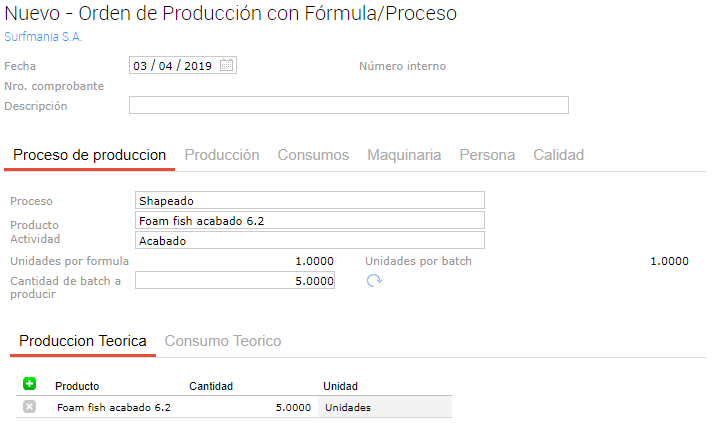 Luego, como se puede ver a continuación el sistema completa la solapa producción con los productos necesarios para realizar la producción indicada. Además, se pueden ver los semielaborados a realizar, es decir, el producto “Tabla clásica sin acabar 6.2” y “Foam clásico acabado 6.2”. La relación entre estos productos se define en las fórmulas de producción, las que se denominan “fórmulas anidadas”. Saber más+.