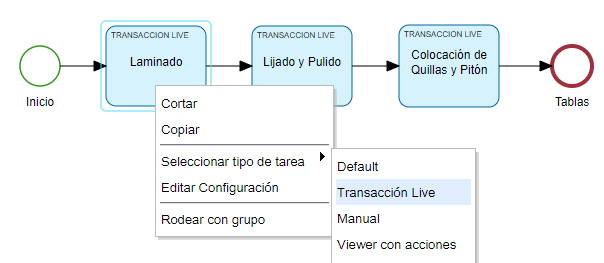 En primer se debe marca la actividad con el botón derecho del mouse e indicar que corresponde a una tarea del tipo “Transacción live”
