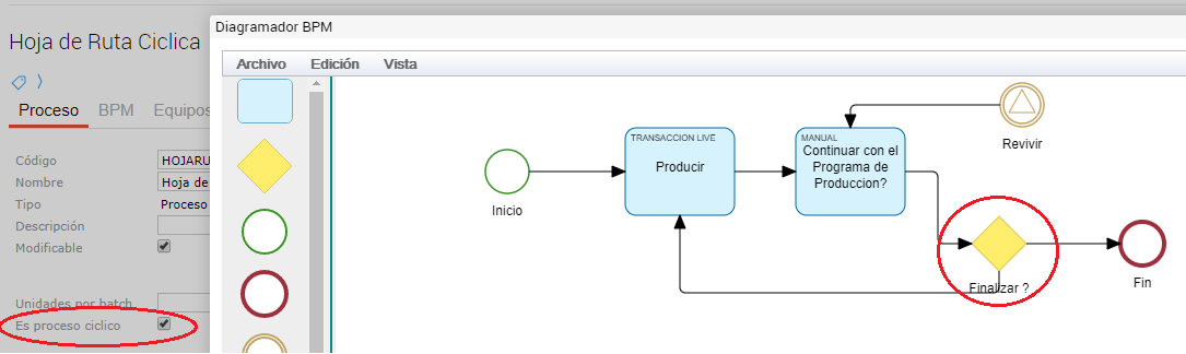 Si se indica “es proceso cíclico” el sistema propone para cada vez que se va a producir las unidades pendientes (si no, traerá de nuevo las cantidades indicadas en la hoja de ruta). Y en el nodo de decisión “Finalizar?” se indica si se quiere volver a producir para poder terminar con las las unidades pendientes o si se desea finalizar.