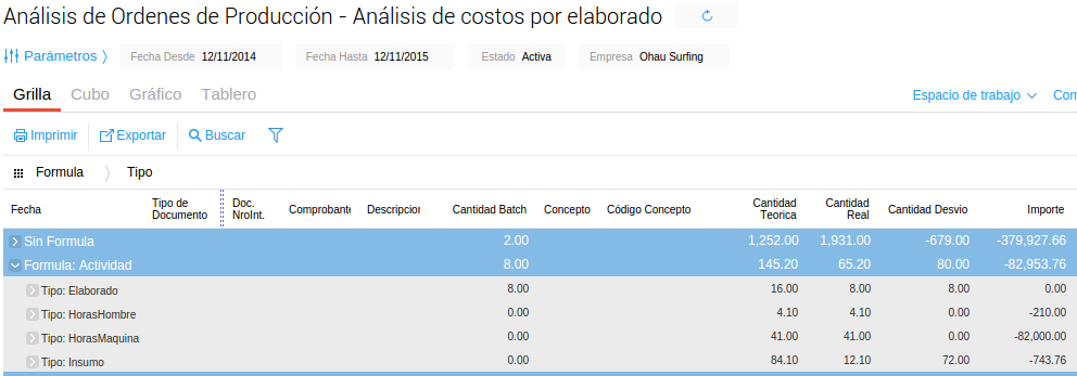 Al explotar la producción del programa MRP, el sistema vincula las cantidades ingresadas de elaborados con las cantidades de insumos definidos en las fórmulas de producción y calcula la cantidad necesaria de cada insumo para cumplir con los objetivos de producción.