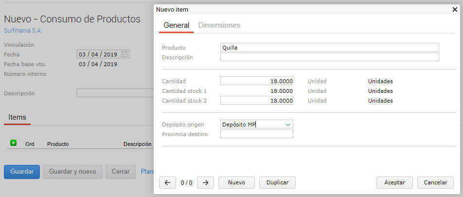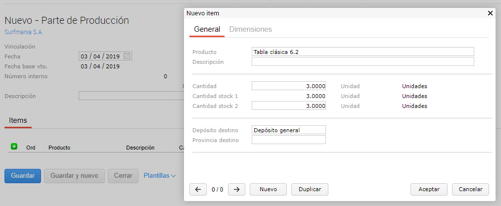 En la solapa “Producción” se debe indicar el producto que se definió en la cabecera, la cantidad a elaborar y el depósito destino.
