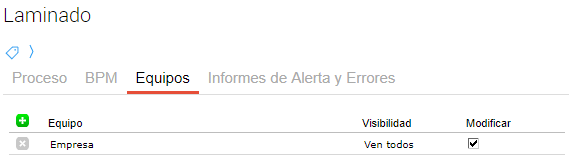En la solapa “Equipos” se indica qué equipos tendrán permiso para comenzar el proceso productivo. Por otro lado, es necesario configurar la visibilidad y la posibilidad de modificar.