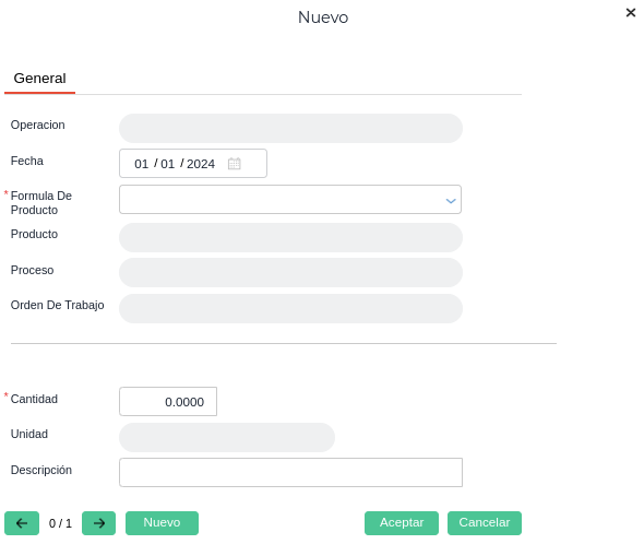 Fórmula del producto: se define la fórmula del producto que se va a producir. Es un campo obligatorio.