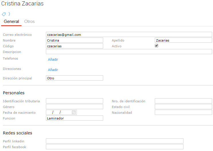 En este maestro se debe completar el código, nombre, el check de activo y la función que desempeña la persona (cargada previamente en el maestro de funciones).