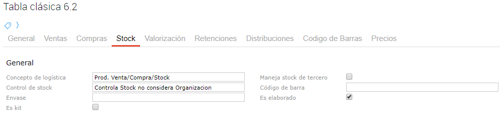 En la solapa “Stock” se debe completar la sección “General” con la siguiente información: