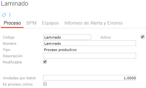 En la solapa “Proceso” se indica que el proceso está activo, nombre y código. Se debe chequear que sea “Modificable” y se indican las unidades por batch como “1”, pues, en la fórmula de producción se deberá indicar el lote óptimo de producción.