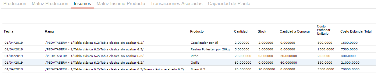 Se muestran los insumos requeridos para la producción. La información se muestra detallada en columnas: Fecha, Rama, Producto, Cantidad necesaria, Cantidad utilizada que se encontraba en stock, Cantidad a comprar (cantidad necesaria - stock en depósito utilizado). También se visualizan los Costos Estándar Unitarios y Costo Estándar Total del insumo (cantidad * costo estándar unitario).