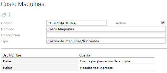 El campo “esquema contable” levanta los esquemas que fueron definidos en el respectivo maestro. Por default el sistema va a proponer el esquema contable “Costo Máquinas” que involucra la siguientes cuentas contables: