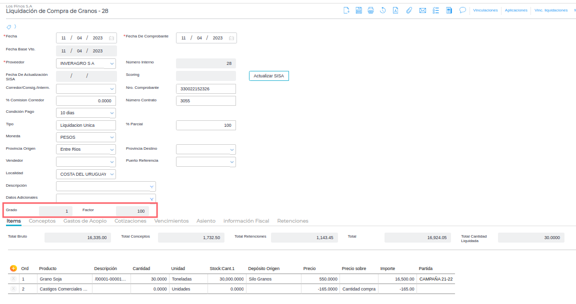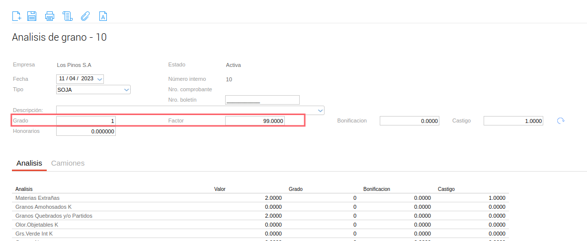 - Cargar los valores del análisis y guardar la transacción, en este quedarán registrados los valores del Grado y Factor: