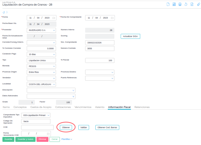 - En caso de requerir el COE desde Finnegans GO, hacer click en el botón “Obtener”