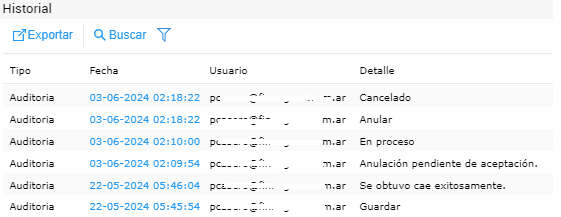 En el Historial de la transacción podrá verse el resultado de la validación.