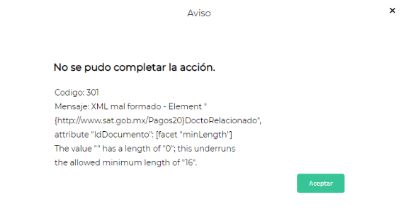 Se realiza un complemento de pago con asistente y al querer timbrarlo se emite un mensaje de error