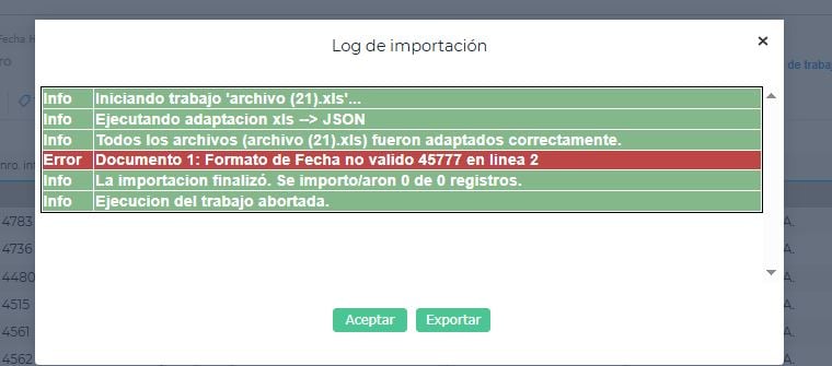 El mensaje de advertencia “Formato de fecha no es válido 45777 en línea 2” indica que el formato de la fecha en la línea 2 del archivo de importación no es válido según las configuraciones del sistema. El formato de fecha aceptado depende del formato de la celda en el archivo de Excel.