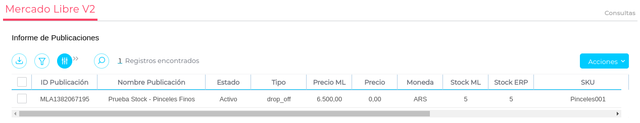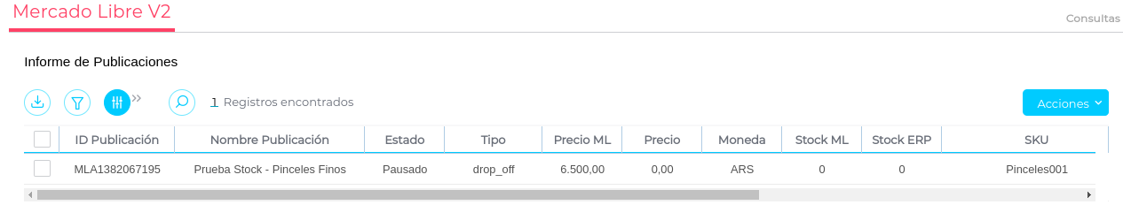 Las publicaciones de Mercado Libre que nunca tuvieron stock en el ERP, no mostraran Stock en el Informe de Publicaciones. Sólo se mostrarán cantidades en “0” cuando hayan tenido ingresos en Stock del Depósito configurado.