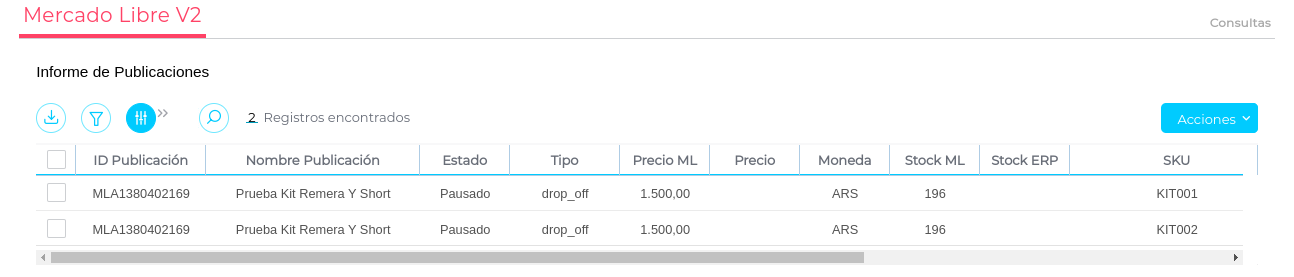 Otras como se ve, muestran el campo “vacío”, en estos casos éstas publicaciones nunca tuvieron stock en depósito, por lo tanto no muestran Stock ERP y tampoco Precio.