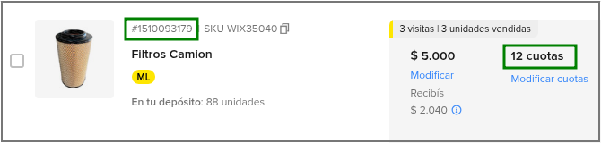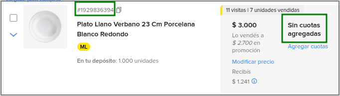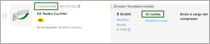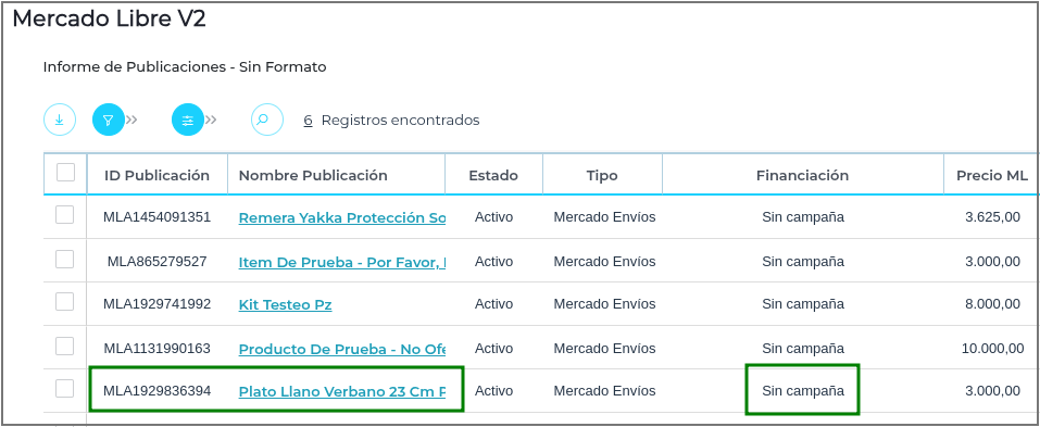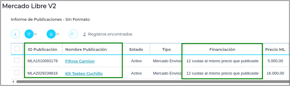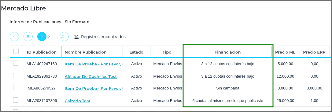 Para los ID de Publicaciones en Mercado Libre, es posible visualizar el tipo de financiación asociado a cada una: