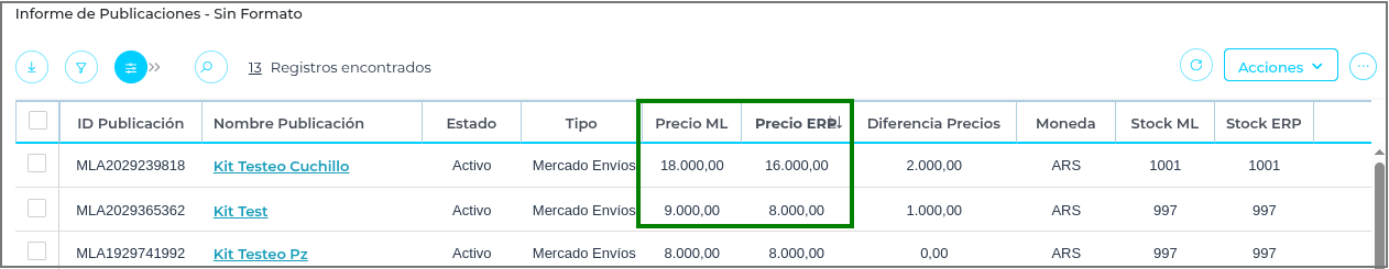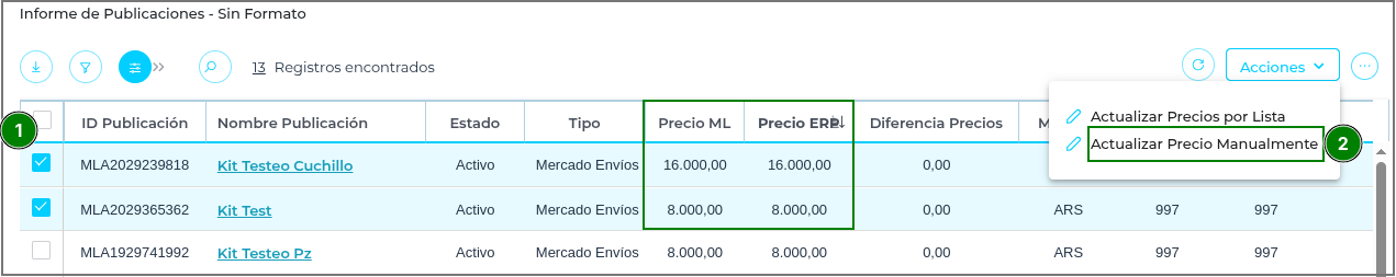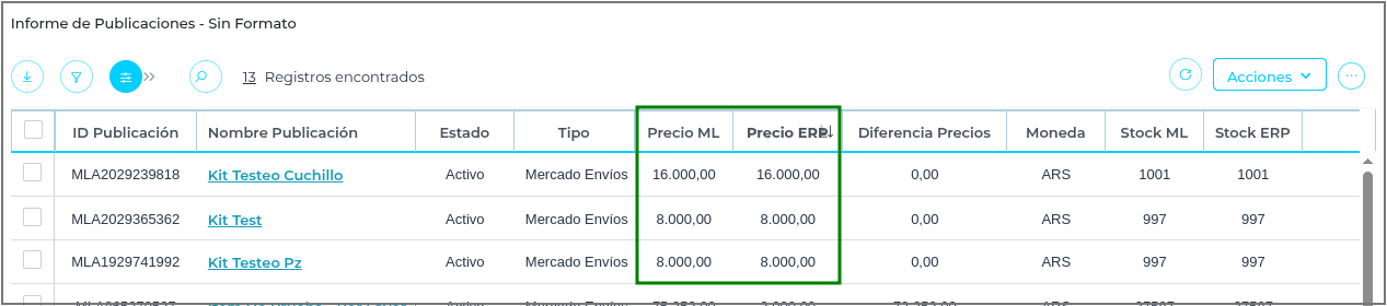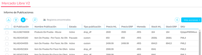 Lista de Precio: corresponde a la Lista de Precios de Venta registrada en el ERP. Contiene los productos vinculados a las publicaciones de Mercado Libre y sirve como base para actualizar los precios de dichas publicaciones. Estos valores se visualizan en la columna “Precio ERP”. Es decir, los precios de las publicaciones en Mercado Libre se actualizan según la Lista de Precio seleccionada en el parámetro al ingresar al Informe de Publicaciones. No es necesario que el producto tenga stock en el erp para actualizar el precio solo que el producto tenga precio en la lista de precios.