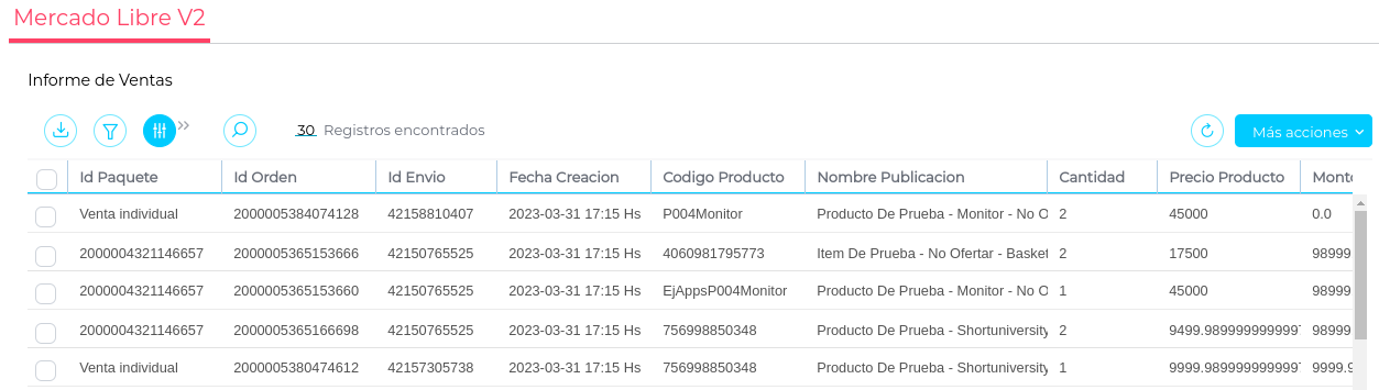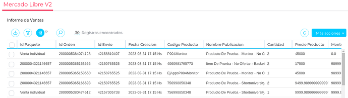 Visualizar información relacionada a la venta como ID Paquete, ID Orden, ID Envío Fecha creación, Nombre publicación, SKU , Cantidad, Precio ML, Importe total.
