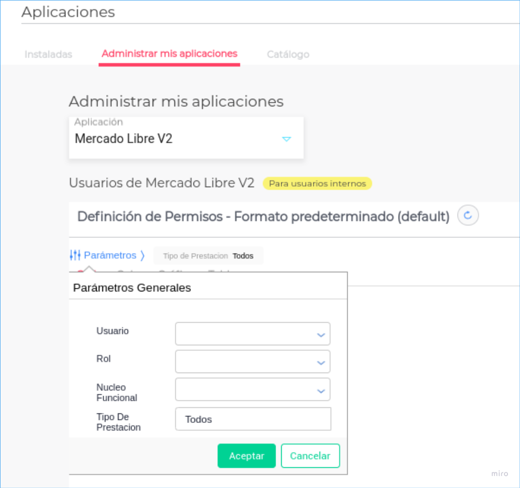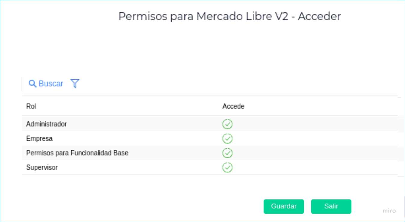 - En el pop que se abre, marcar los permisos a otorgar según el rol del usuario en la aplicación, y presionar “Guardar”.