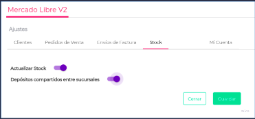 También se podrá configurar si se habilita o no Depósitos compartidos entre sucursales. Si el check está activo, se considerará el stock total del Depósito configurado, independientemente de la sucursal vinculada. Caso contrario, sólo se considerará del Depósito configurado, el stock correspondiente a la sucursal vinculada.