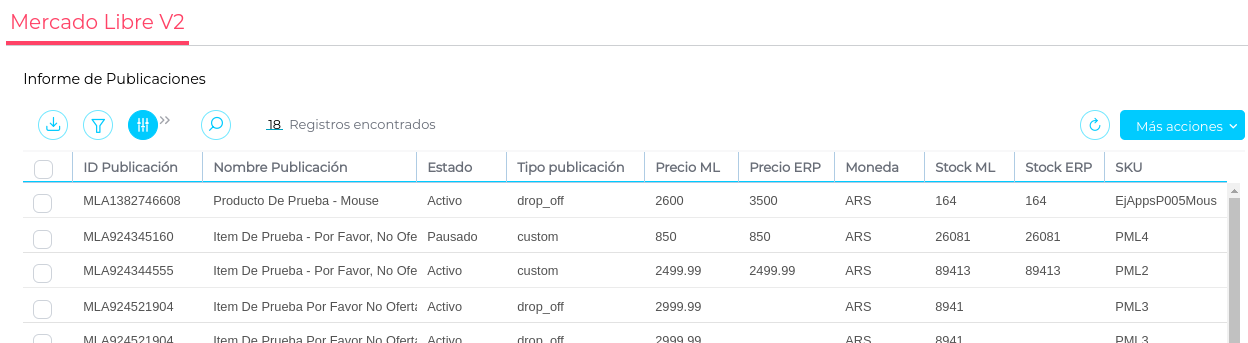 Visualizar los productos publicados en MercadoLibre y su información relacionada como ID , nombre, estado y tipo de publicación.