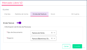 En esta pestaña se requiere activar o no el envío de Facturas a MercadoLibre.