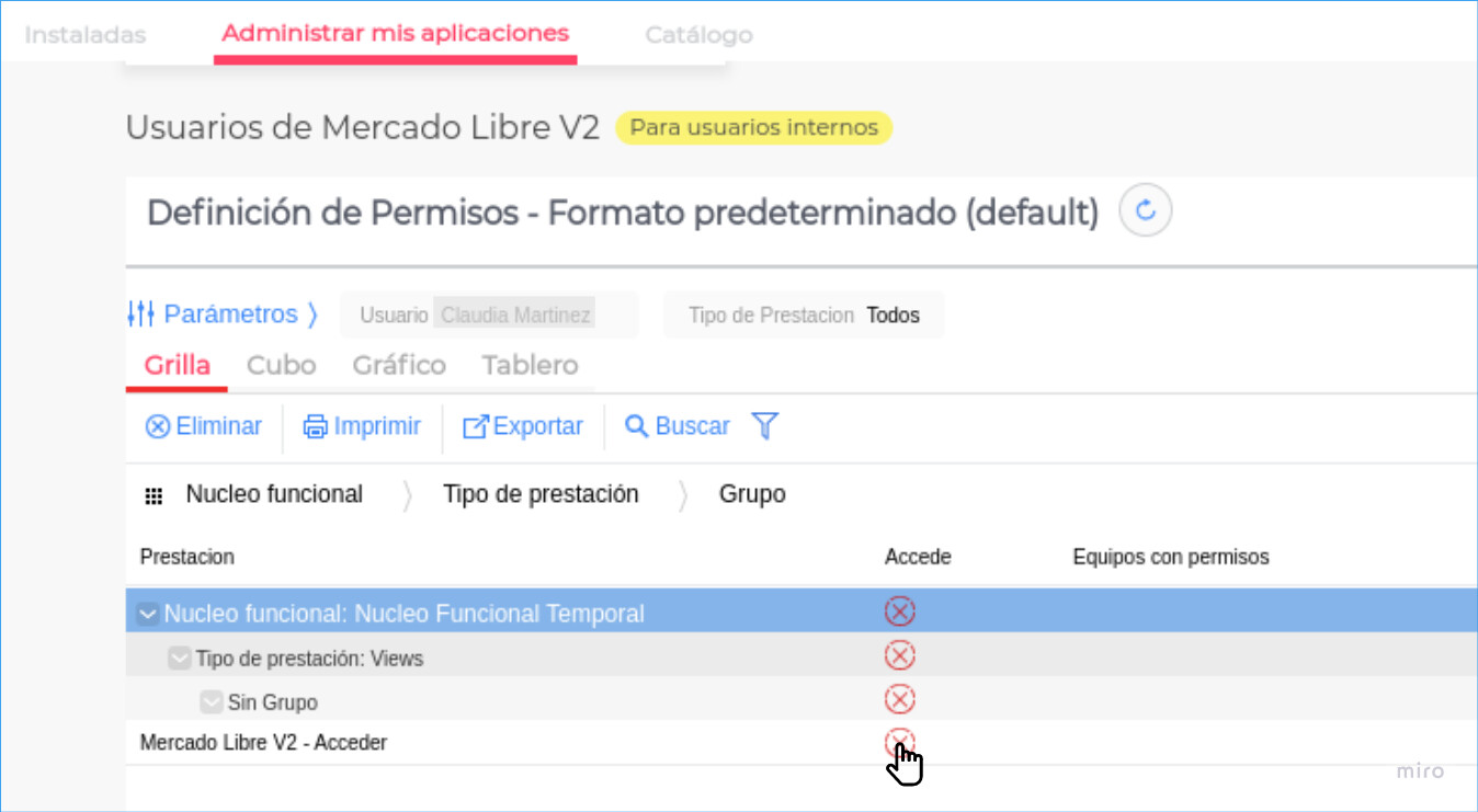 - En esta pantalla de permisos, presionar como se ve en la imagen, sobre la cruz roja en la fila de Mercado Libre: